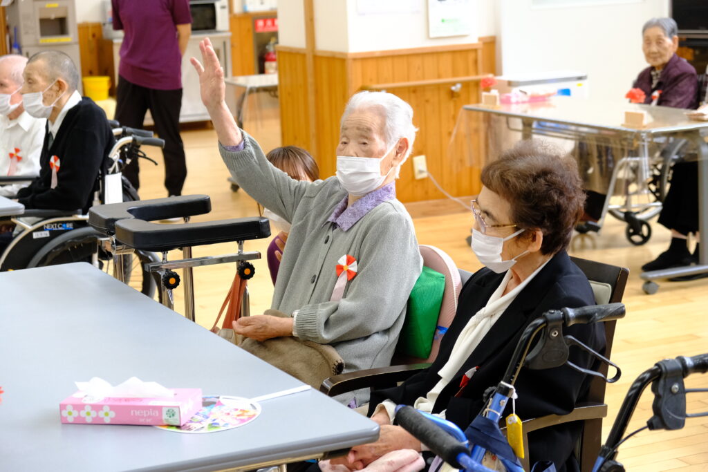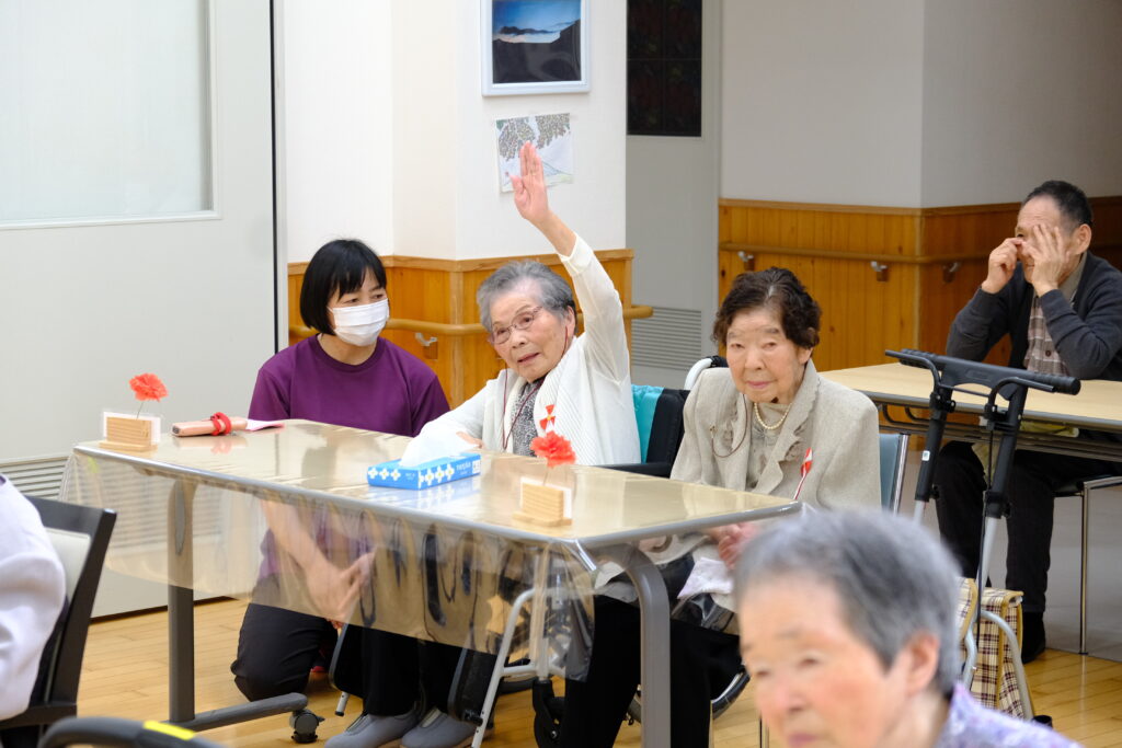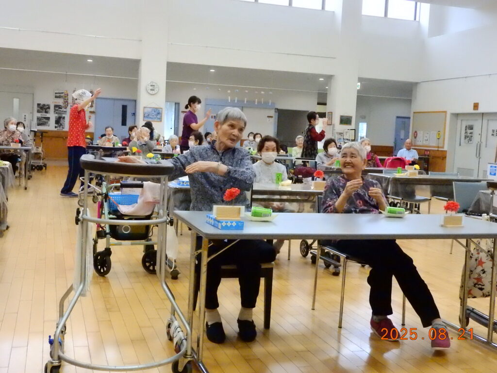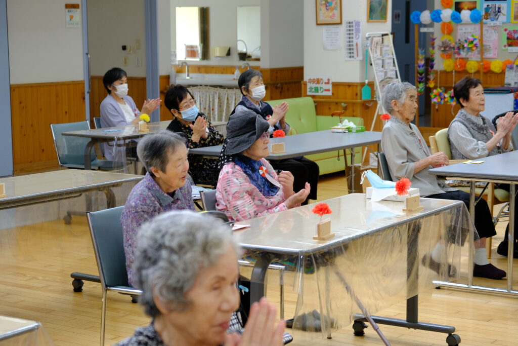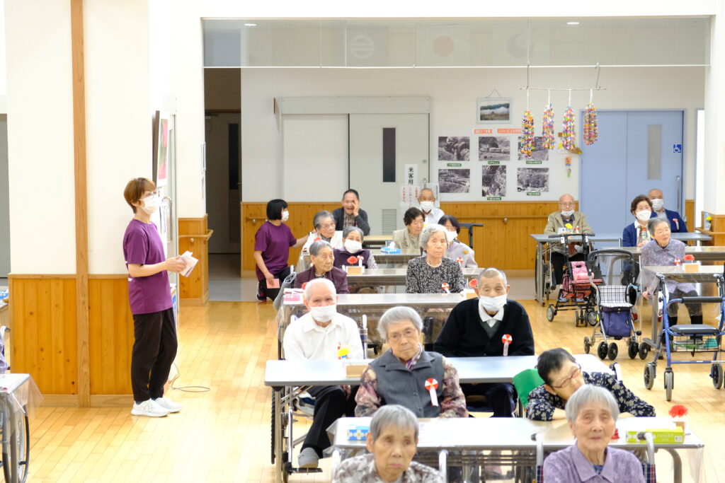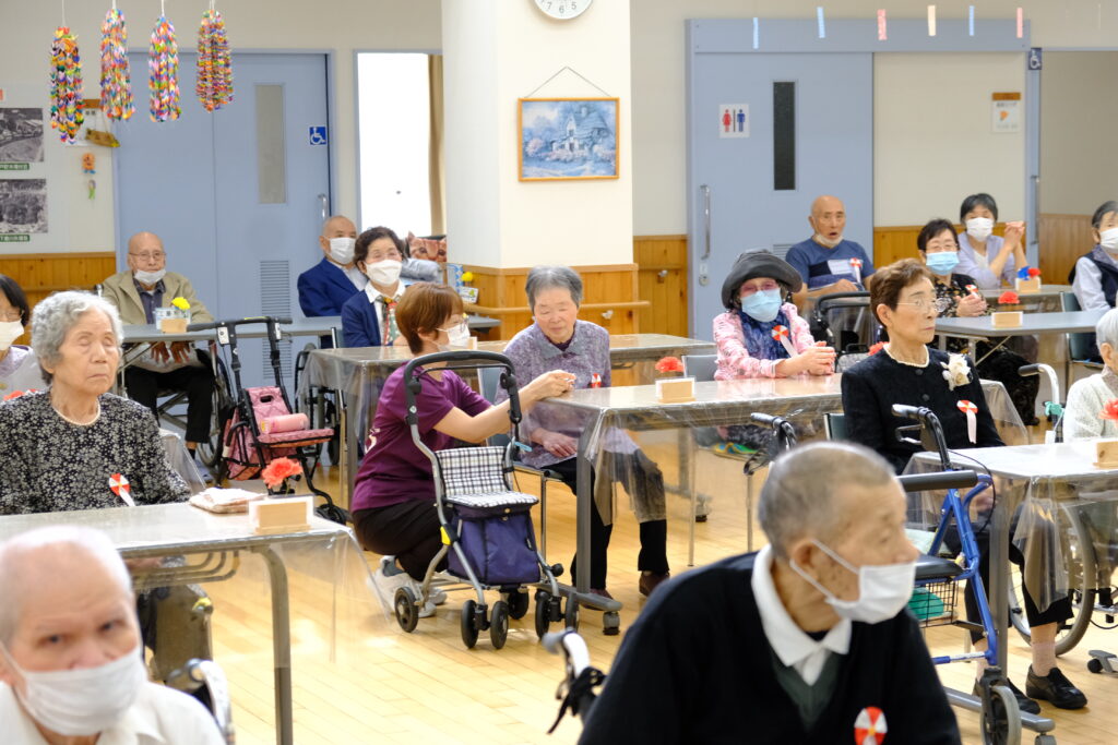 9月18日、敬老会を開催しました。コロナ前は、たくさんのご来賓やご家族にもお越しいただき、昼食はホールや入居者のお部屋などで、ご一緒にお食事をして頂いておりましたが、未だに解除出来ず申し訳ございません。 出来れば、今後、ご家族様と共に敬老のお祝いが出来ればと思います。また、その際には、ご家族の皆様方との交流や相談会等を考えております。